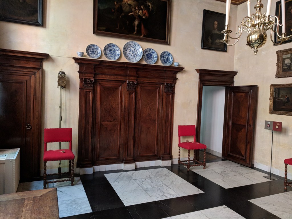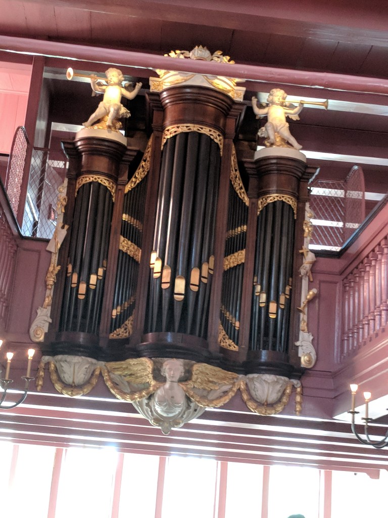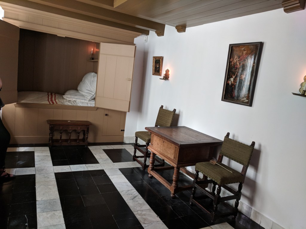 With the Markinks, we revisited Amsterdam to see some of the things they had not yet visited. One of the gems only a local might find was Ons’ Lieve Heer Op Solder (Our Lord in the Attic), a fully operating secret Catholic Church, hidden in the home of a linen dealer during the Reformation in the 16th century. The government of the Netherlands adopted the Dutch Reformed Church as their offical church and took over all of the Catholic Churches in the area for their own. Catholics continued to worship but were forced to go underground and change their format drastically. A linen merchant allowed the church to transform the top three floors of his home on the canal in the Red Light District into a secret center of worship for Catholics all over Amsterdam. And boy, was it transformed. It had a rectory, confessionals, baptistery, organ, and an absolutely beautiful sanctuary replete with altar, pews, a fold-out pulpit, and enough artwork and ornamentation to rival any cathedral. Above this cathedral was the storeroom and pulley of a fully working linen warehouse. No one would ever know the most important business that was done there: That of preserving a dedicated group of faithful congregants.