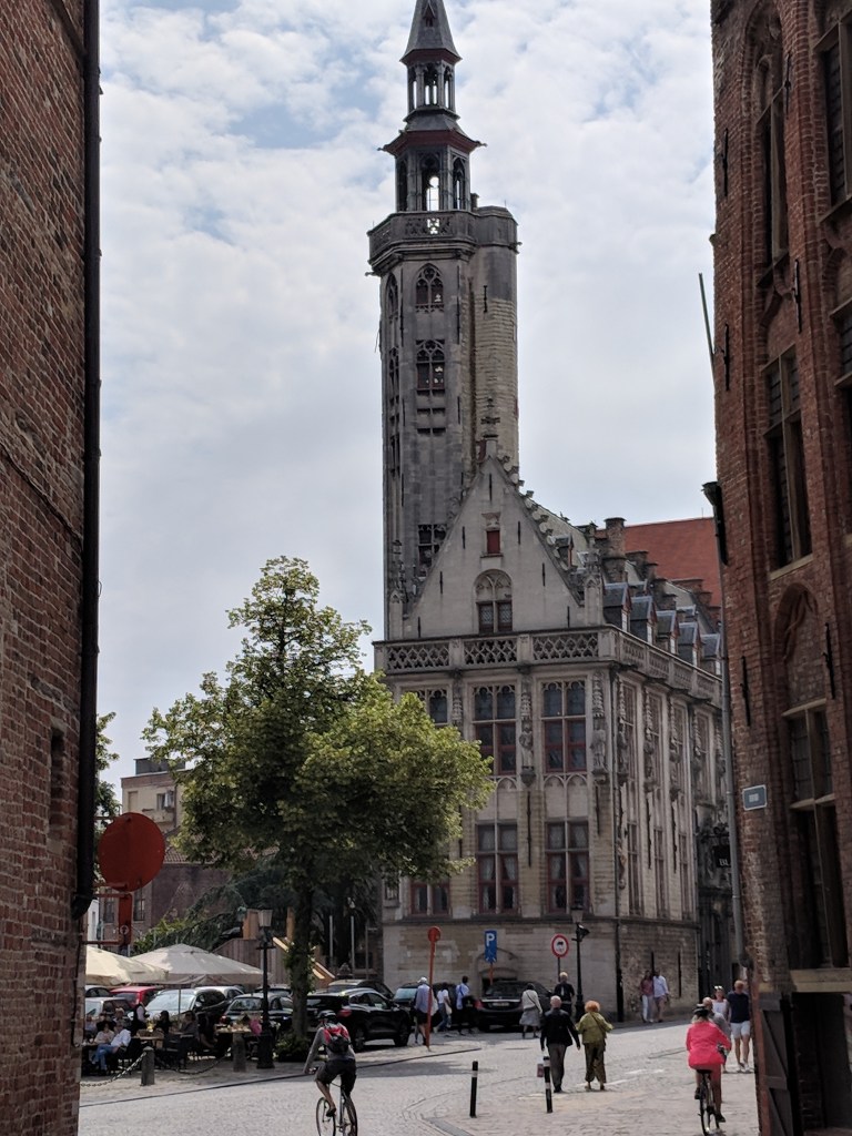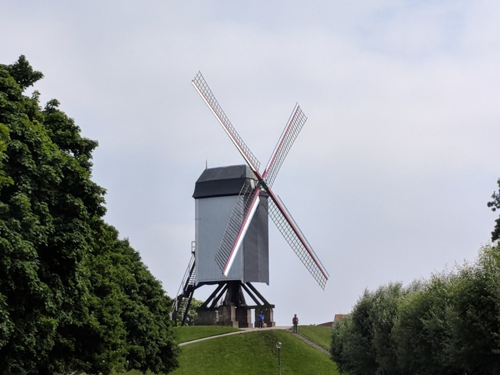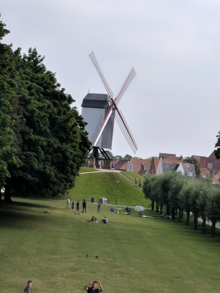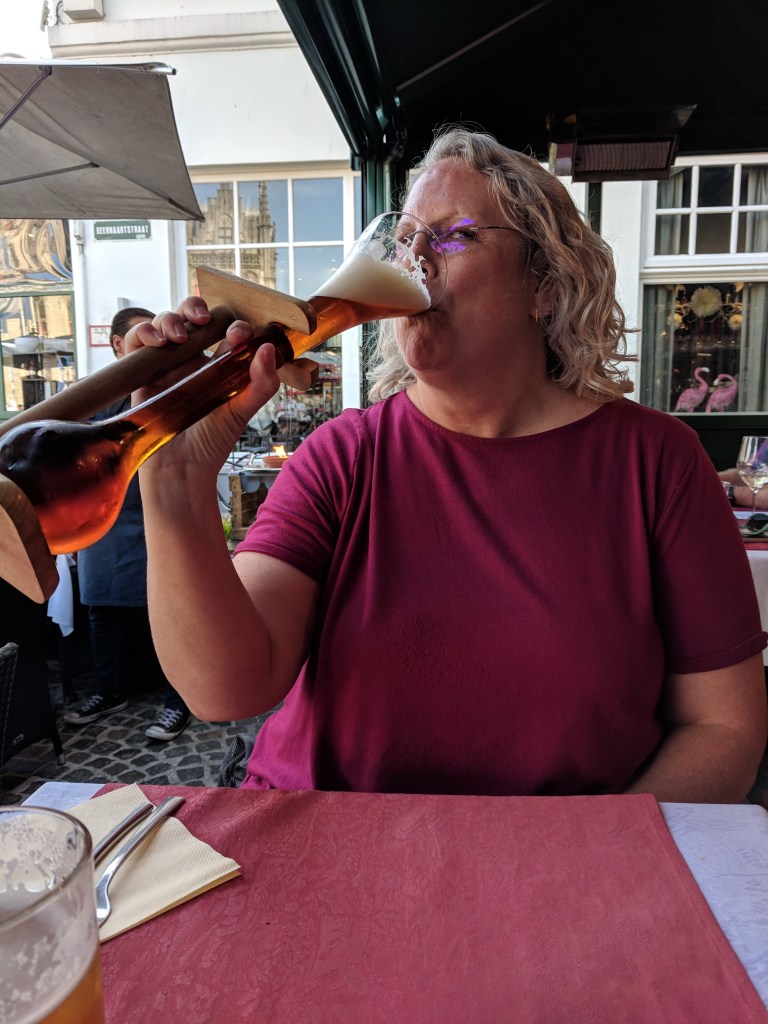 We also saw windmills in Bruges, and we had some Belgian food and beer as well! We walked around the outside of the city to see the windmills, as well as the various city gates. Our walk had made us hungry and thirsty. We selected a restaurant on the markt (the square, or marketplace) and asked for tap water. Our server said, “You can have a bottle of water for 6 Euros, but the real Belgian water is beer.” I’m not a beer lover, but I have now tried several beers, and somehow they are better than paying 6 euros for water! We’ve tried Jupiler, Leffe, Zot, Delirium Tremens (served in a ceramic bottle), and my ultimate favorite, Kwak (shown in the extra large glass that looks like a work of art in itself).