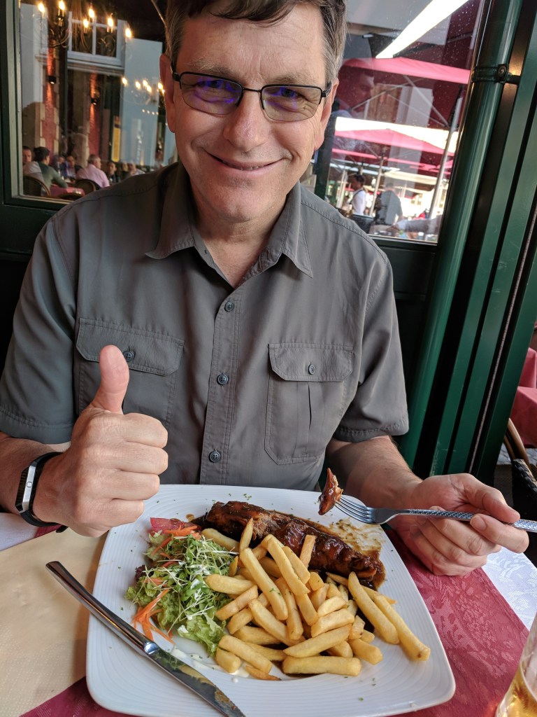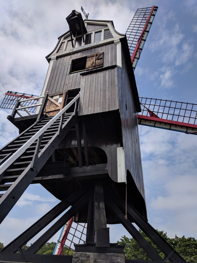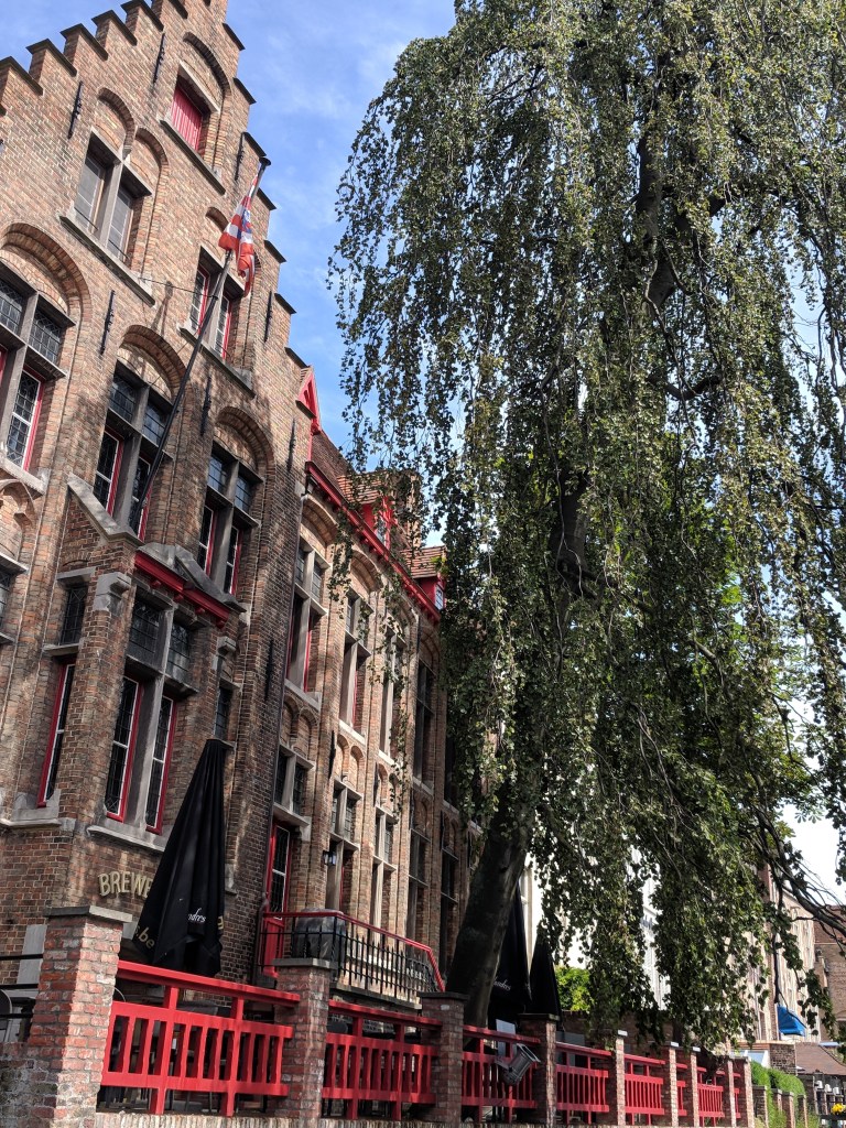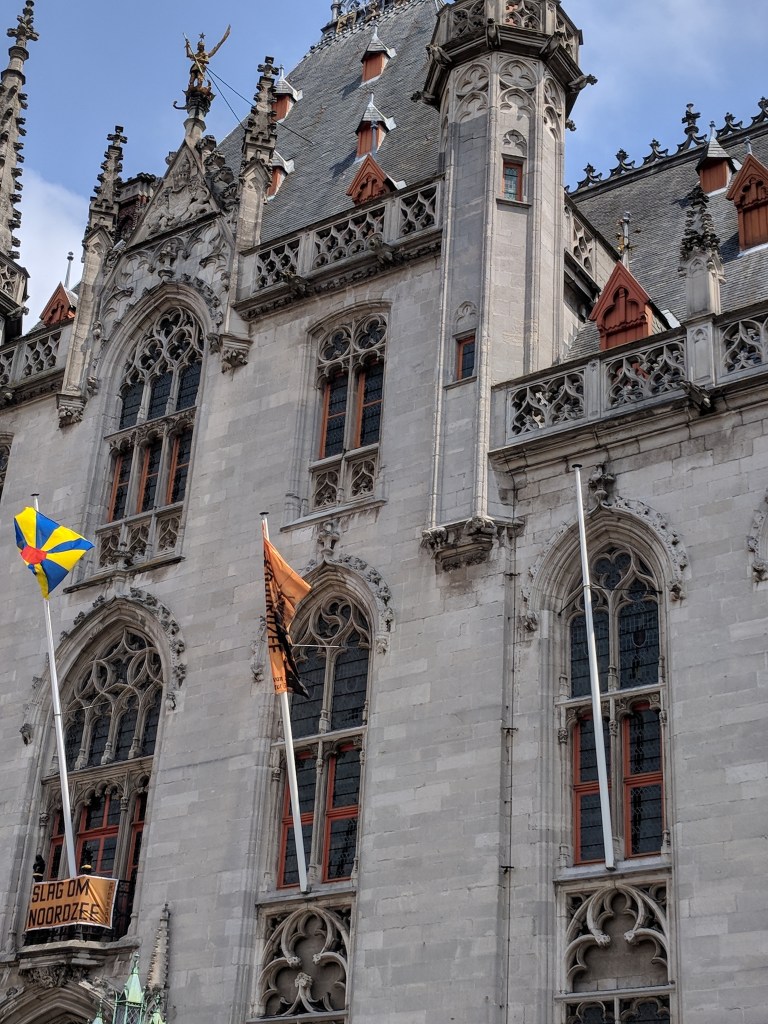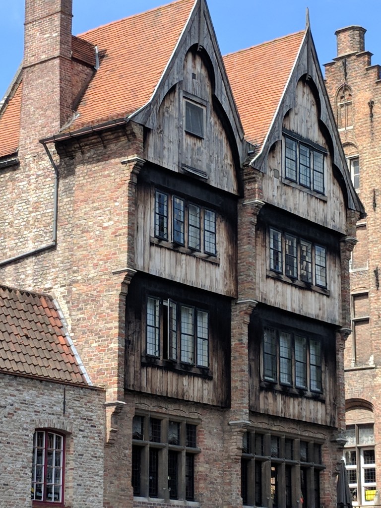 We also saw windmills in Bruges, and we had some Belgian food and beer as well! We walked around the outside of the city to see the windmills, as well as the various city gates. Our walk had made us hungry and thirsty. We selected a restaurant on the markt (the square, or marketplace) and asked for tap water. Our server said, “You can have a bottle of water for 6 Euros, but the real Belgian water is beer.” I’m not a beer lover, but I have now tried several beers, and somehow they are better than paying 6 euros for water! We’ve tried Jupiler, Leffe, Zot, Delirium Tremens (served in a ceramic bottle), and my ultimate favorite, Kwak (shown in the extra large glass that looks like a work of art in itself).