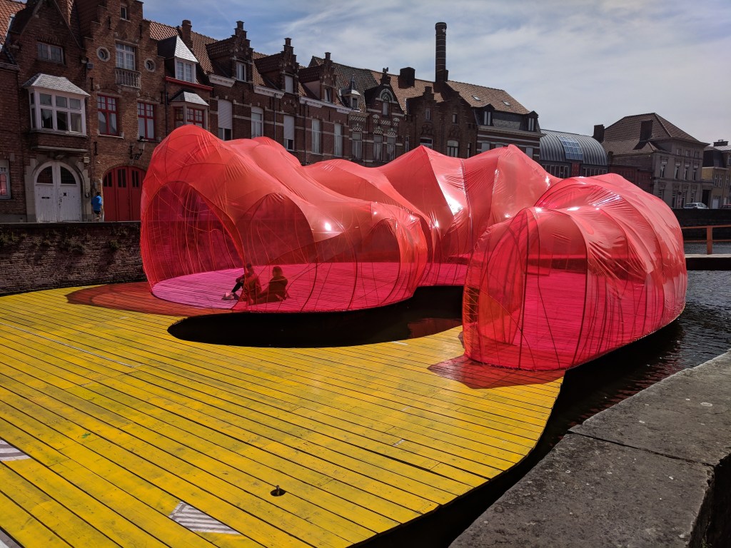 Bruges is medieval grandeur and quaint cottages at the same time. It was built by the Vikings in the 9th century as a harbor on the River Zwin. By the 12th century, the river had gotten too much silt, but Bruges was still known for its Flemish cloth. Now it is a cultural city for Belgium, evidenced by its examples of modern art and architecture shown below.