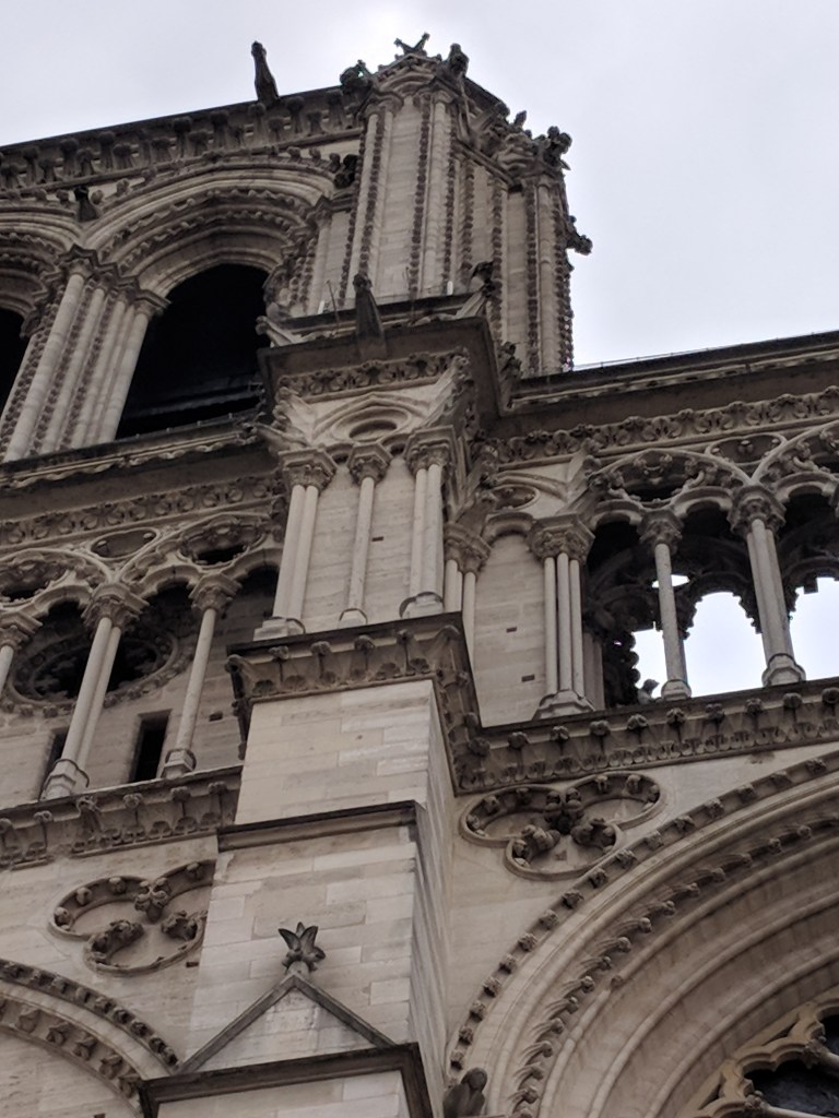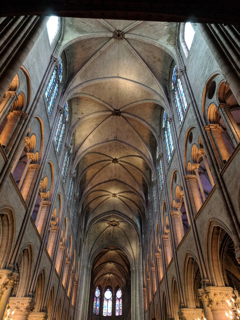 Notre Dame, translated Our Lady, is one of the first gothic cathedrals in the world. It revolutionized architecture because for the first time, a building that large could be built without the arches they had used before, making buildings very thick on the bottom and not very tall. The secret was using ribbed vaults that crossed in the middle for strength and extended outside the building to prevent the walls from falling inward: Flying Buttresses. And what a beautiful example of architecture Notre Dame is, especially since it actually used double flying buttresses, allowing the building to stretch even higher towards Heaven.