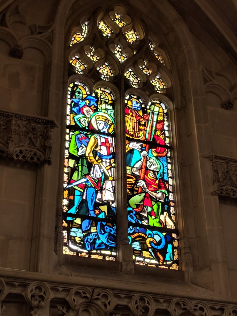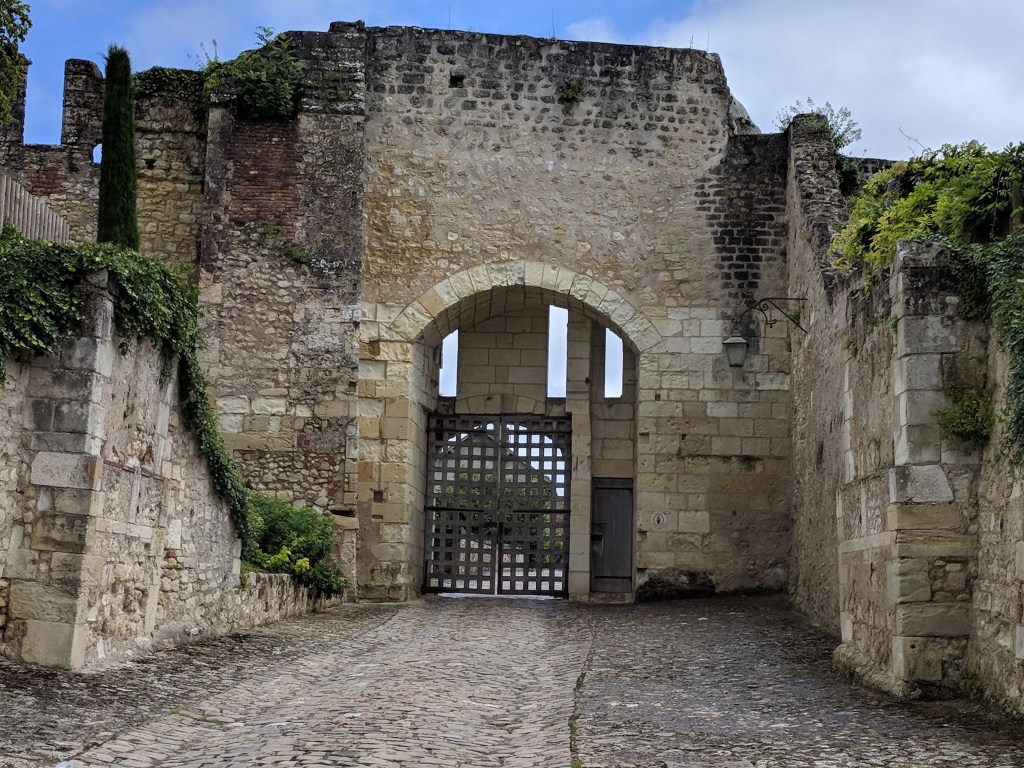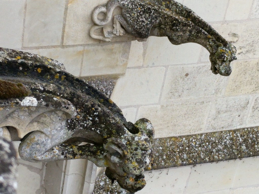 We saw some other symbols in this castle as well, including a crest, divided down the middle, with several symbols of the French fleur de lis on one side, a line drawn down the middle, and the English ermine symbol on the other side. This symbolized that at the time this crest was made, there was an alliance between France and England. We saw more stones signed by the masons who created them, and we also saw some very … we’ll say interesting… sculptures at the top of each of the posts spiraling up one of the entrances to the chateau. Some were funny, like the one scratching his, um, backside and others were just plain obscene, and I won’t even described them here.