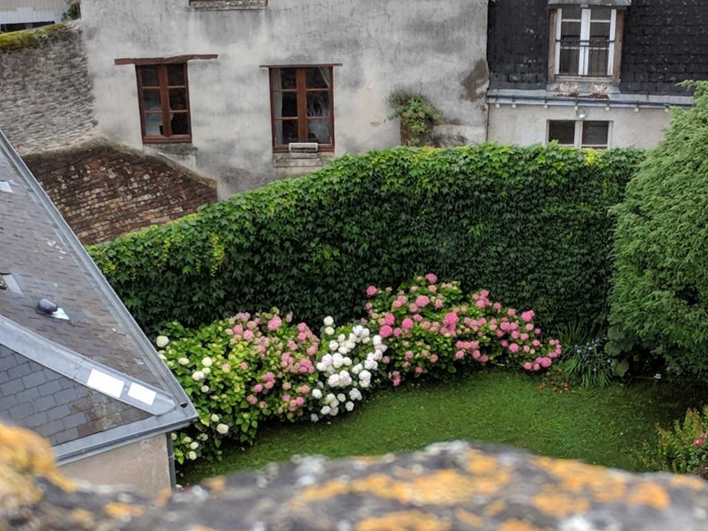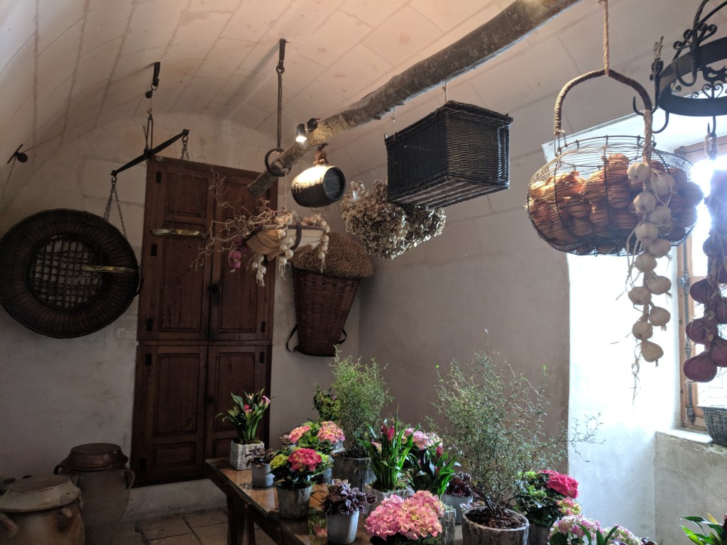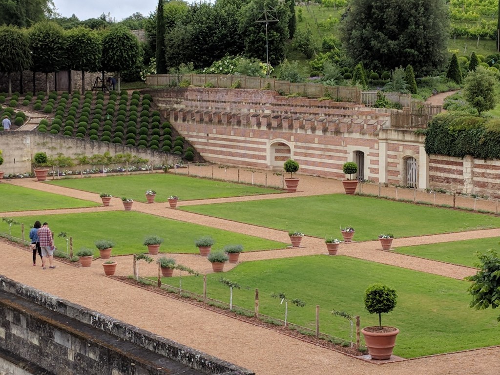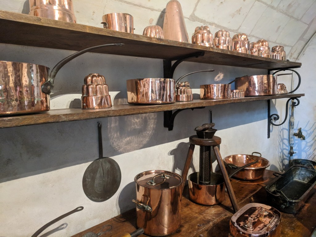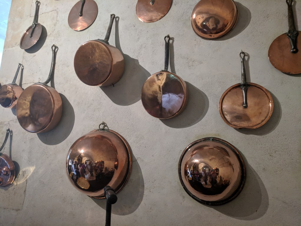 We drove on, saw other chateaux from the outside, and finally toured our last one. This was Chateau de Chenonceau (pronounced chee no so), acquired in exchange for debts for the mistress of King Henry II, Diane de Poitiers. As we walked around, it was clear to see it had not been designed as a royal residence and had, in fact, been designed by a woman (Katherine Briçonnet in 1515-1521). Unlike the chateaux that were clearly built for fortification and awareness of approaching enemies, this one was built for serenity and beauty, with lots of windows to overlook the lazy river and surrounding forest. It had beautiful groomed gardens and more kitchens than any dwelling we had ever seen! There was an entire separate kitchen for each purpose: butchery, bakery, preparation, and more.