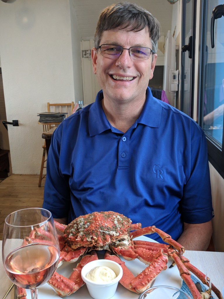 He gave us a specific restaurant to visit for dinner, and I was really glad we followed his recommendation. I think Bill was too, but only because of what we saw AFTER dinner. At La Madison Bleue, I had king crab that turned out to be surprisingly tiny (it is not pictured here), and Bill had another crab whose name we don’t remember, but our server said it would offer more food and be “like a spider.” It is pictured above in front of Bill. Both crabs and two glasses of delicious French wine were only 38 euros. Sweet!