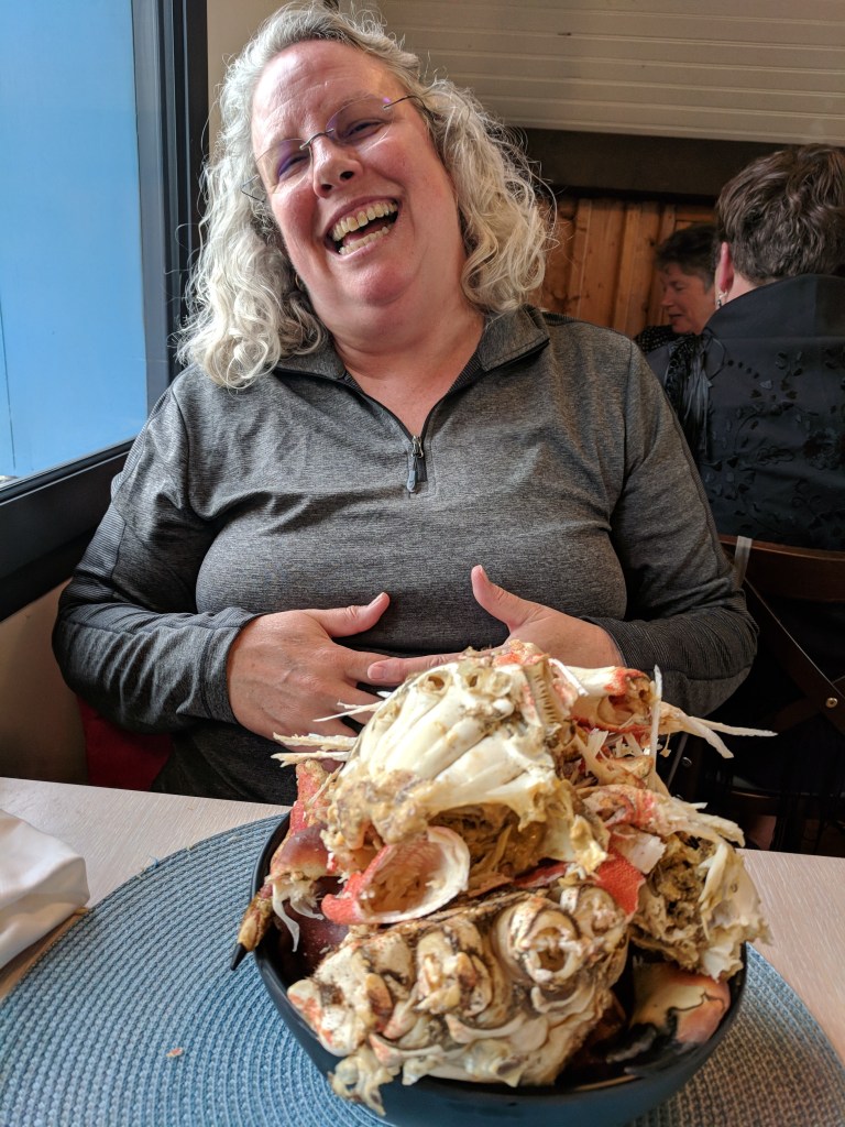 However, you may notice that the French don’t serve seafood like Red Lobster does. First of all, our crabs had everything in them, and I mean everything. If you’ve ever had an uncleaned crab, you know what I mean. If you haven’t, I’ll put it this way: If you try to eat the meat from the body itself, you end up with messy brown stuff all over your silverware and napkin. Second of all, nothing about the crab is pre-cracked in any way. We’ve never worked so hard eating seafood in our whole lives! For some of the leg sections, it took both of us and all the tools they gave us to crack through them. Third, you can forget the delicious melted garlic butter in which to dip the meat you’ve worn yourself out procuring. That creamy looking stuff you see in the picture? Mayonnaise. We persevered, and you can see the pile of shells we created above, in front of me. I enjoyed the whole ordeal thoroughly, in spite of all the drawbacks. Bill, on the other hand, wasn’t sure if he was really full or had just lost his appetite in the process.