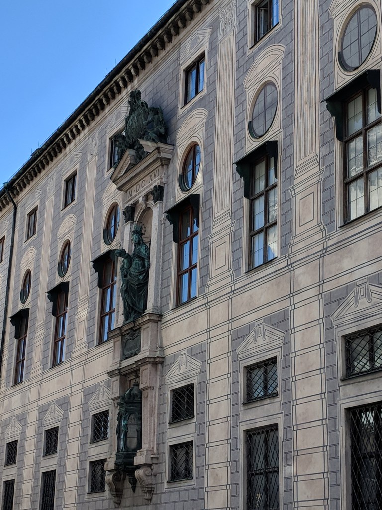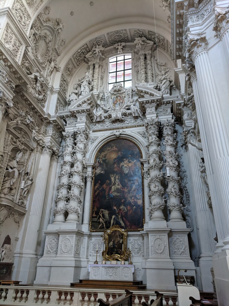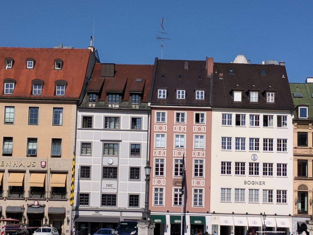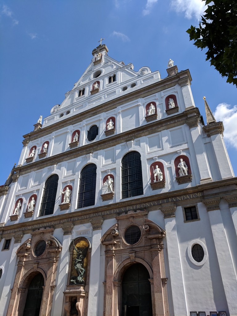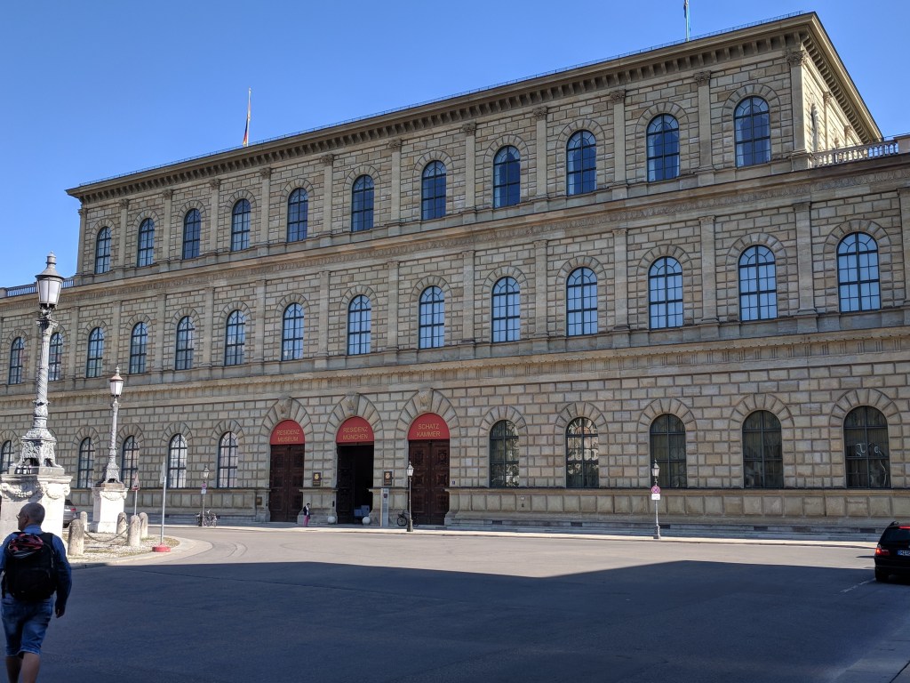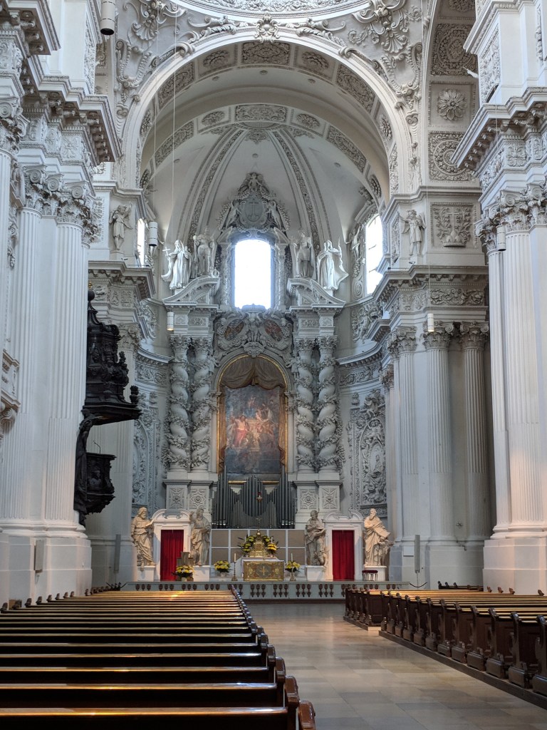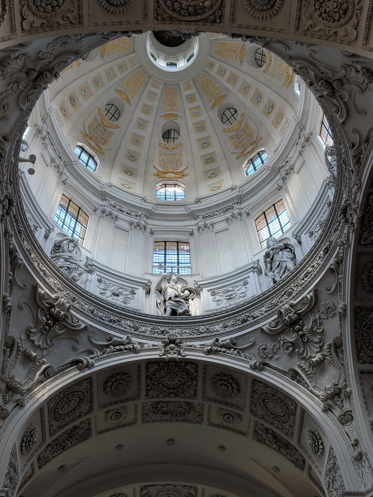 It was difficult, but we finally forced ourselves to leave our air conditioned haven to explore Munich. Bill does a great job of finding lodging close to the Old Town of each city, and Munich was no exception. We walked to the palace where the Bavarian kings resided when they were doing business in the city center. It was in use from 1508 to 1918, when Germany became a republic. We could tell it was NOT built by Ludwig II because it wasn’t nearly lavish enough, although he did add a royal apartment and an enclosed winter garden with a lake. We saw the Church of St. Cajetan, and it definitely WAS lavish enough. It was commissioned in the 1600s by the king and queen when their long-awaited son was born. Its 230 foot high dome and beautiful white baroque interior with intricate plaster work had us in awe.