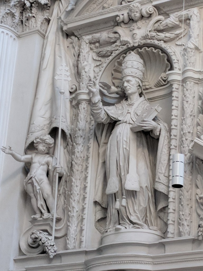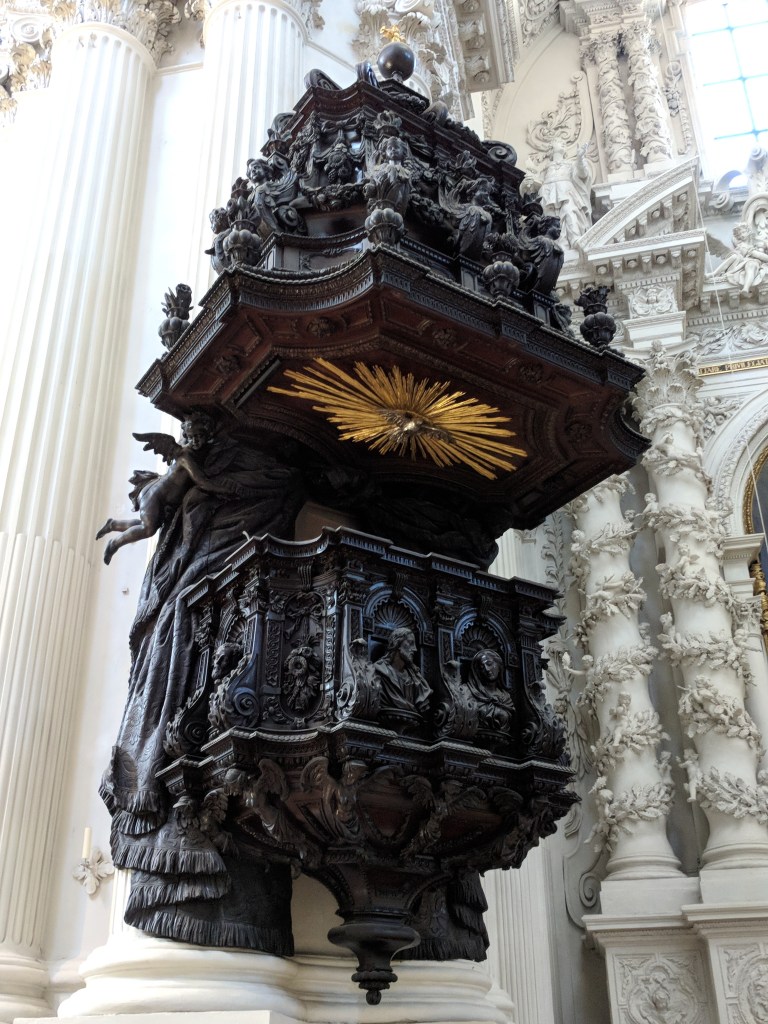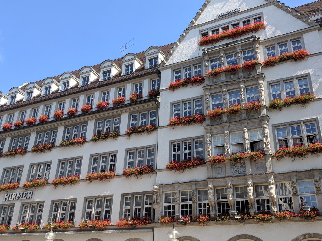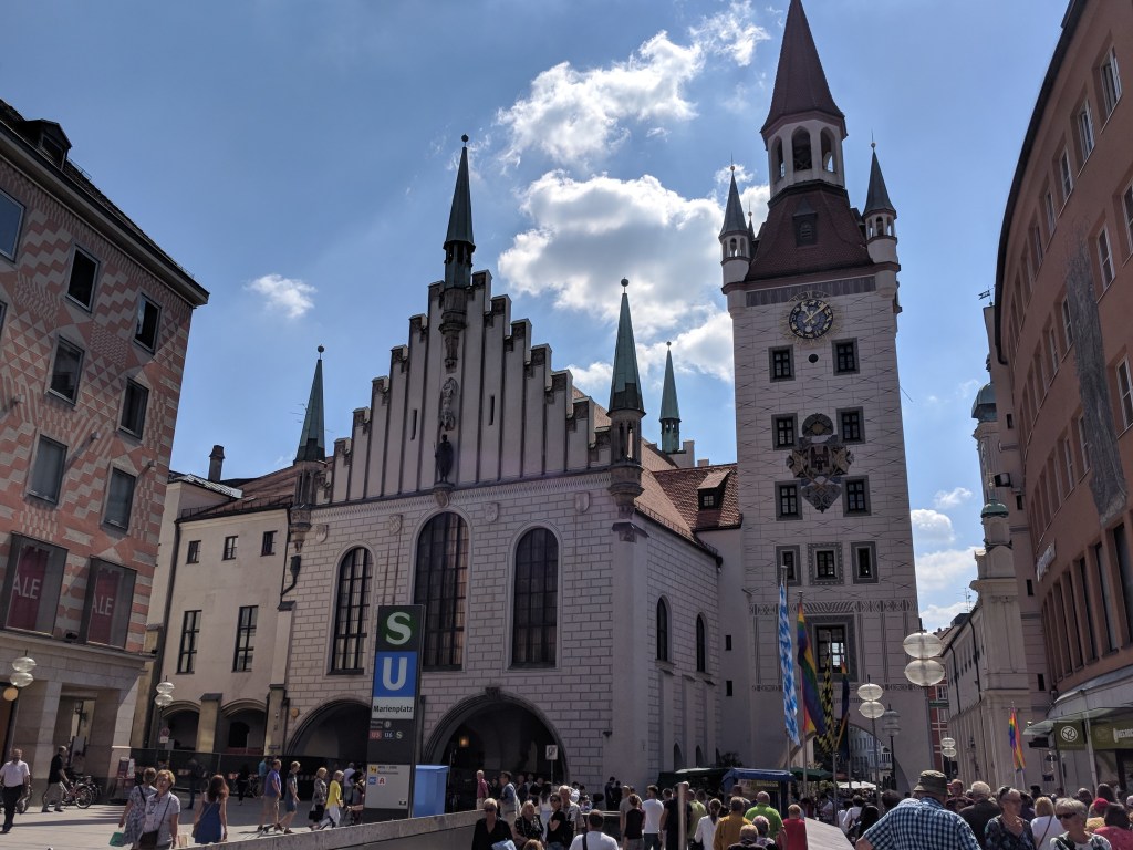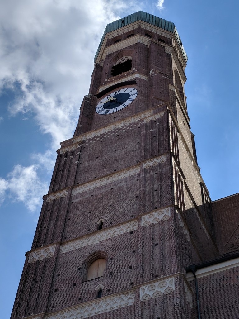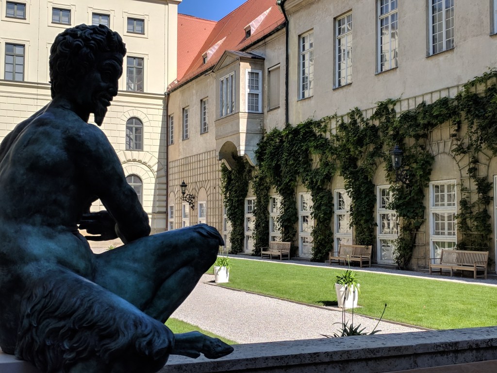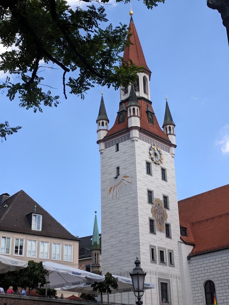 It was difficult, but we finally forced ourselves to leave our air conditioned haven to explore Munich. Bill does a great job of finding lodging close to the Old Town of each city, and Munich was no exception. We walked to the palace where the Bavarian kings resided when they were doing business in the city center. It was in use from 1508 to 1918, when Germany became a republic. We could tell it was NOT built by Ludwig II because it wasn’t nearly lavish enough, although he did add a royal apartment and an enclosed winter garden with a lake. We saw the Church of St. Cajetan, and it definitely WAS lavish enough. It was commissioned in the 1600s by the king and queen when their long-awaited son was born. Its 230 foot high dome and beautiful white baroque interior with intricate plaster work had us in awe.