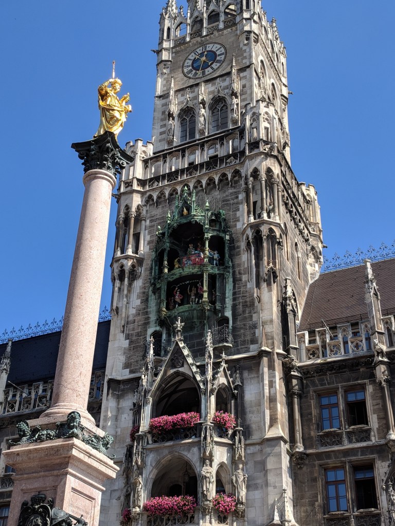 We walked to Marienplatz next, the huge plaza where the town hall stands. It was obvious the town hall WAS designed by Ludwig II, both by its size and its decoration. In the middle of this fancy building stood a tall, steepled clock tower. We’ve taken pictures of a lot of clock towers all over Europe, but this one topped them all. Its front had two flower-covered balconies, two balconies with glockenspiels and moving figures, and a bell tower. Together these balconies have 43 bells and 32 moving figures. One glockenspiel acts out the story of a marriage of one of the dukes, followed by a jousting tournament (the Bavarian knight wins, of course). The other glockenspiel is a reenactment of the coopers dancing through the streets in 1517 when Munich was hit with the plague.