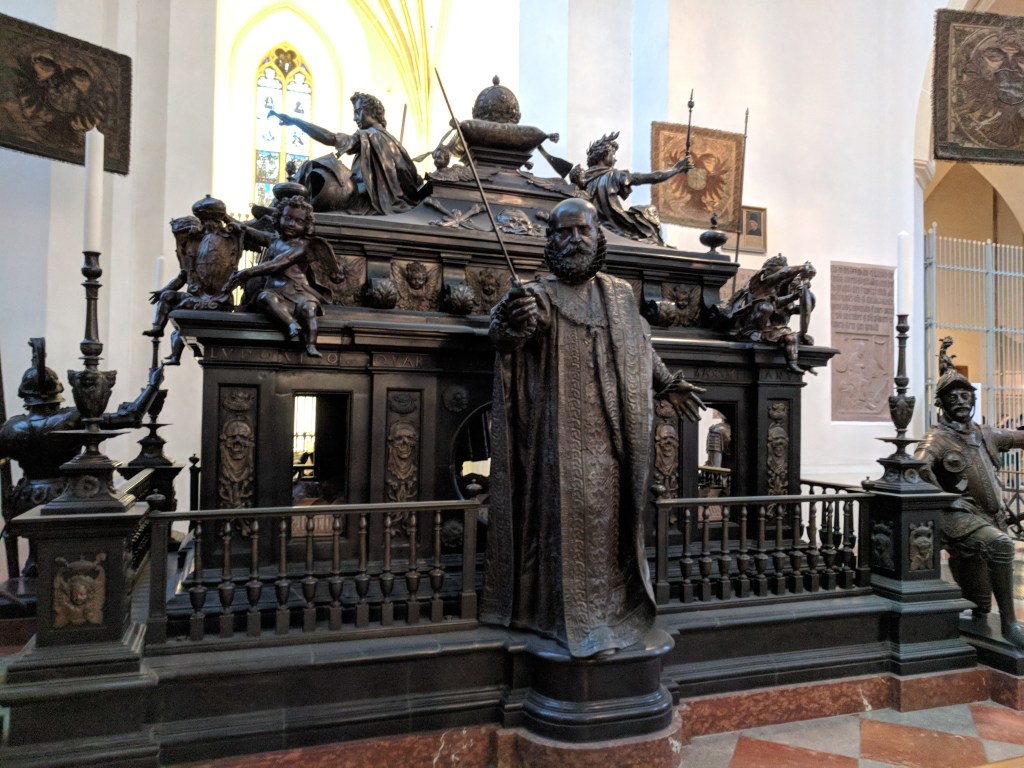 Next we saw the Cathedral of Our Lady, where Ludwig the Bavarian was buried in the 14th century. Its majestic domes tower 318 feet over Munich. It had a beautiful interior, but its exterior was covered with restoration scaffolding.