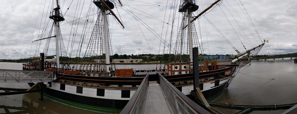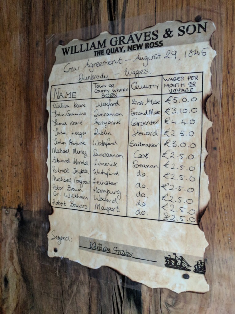 We traveled through time today. We started in the 1849 in New Ross, Ireland at the Dunbrody famine ship. 80% of the Irish at this time were Irish Catholics. Because Ireland was essentially a British colony and Britain was Protestant at the time, Irish Catholics were not allowed to own land. Instead they had to work for Irish landlords who were renting land from absentee landowners back in England. The landowners would divide the land into several smaller parcels, each worked by a tenant farmer. The farmer was expected to give most of his crops to the landlord for his “rent” of the land. The small corner of the plot that was left was usually used for potatoes because they would grow plentifully, even in bad soil, and that was the only crop that produced enough food to feed a family. Since Irish people, were eating only potatoes, they needed seven to fourteen pounds of potatoes per person per day!