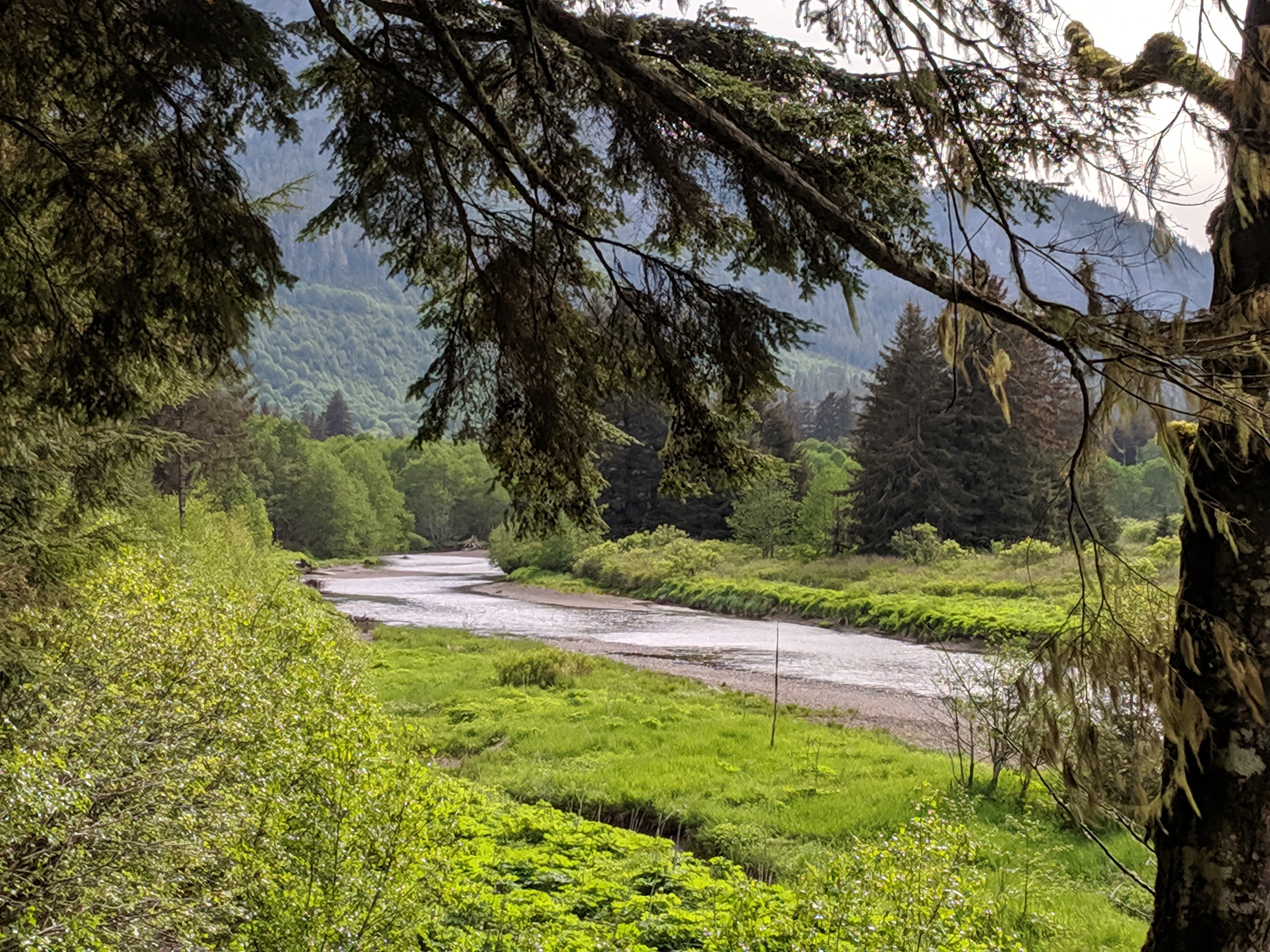 Once across this simple covered bridge to Icy Strait, we were able to take advantage of a tour offered by the native people here. They call the Coastal Brown Bear Grandfather. A Tinglit never hunts the bear, nor does he leave bait of any kind for the benefit of showing the bear to tourists. “It would be like hunting a relative,” our native guide remarked. But they do observe, study, and protect the bear. It was fun to join our guide on the search for him. She knew exactly where he had been spotted that day, and she wasn’t surprised. He had just emerged from hibernation, and his digestive system was in need of a tall grass that grew along the Spasski River. After all, how could he possibly eat salmon if his digestive system was still coming out of sleep? She also assured us that we were in no danger from these huge animals. “Even if he thought you would taste good, he would probably hold his stomach and say, ‘It looks delicious, but I couldn’t possibly…’” she jested.