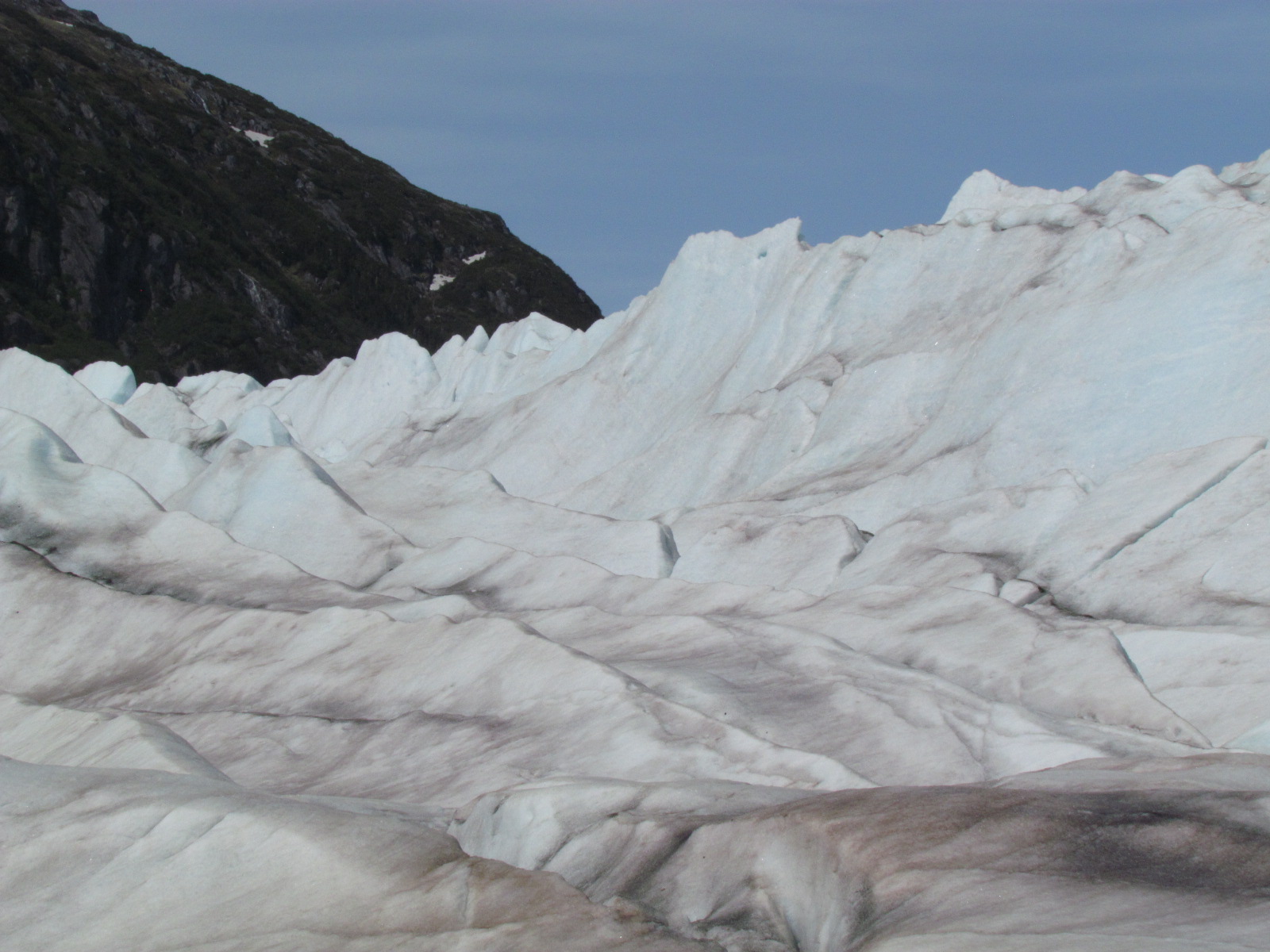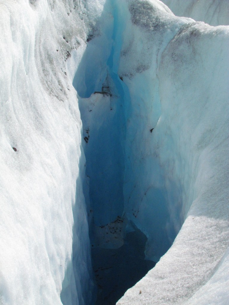 Glaciers don’t provide the nutrients needed for most animals to survive on them, and there is no human access to this glacier outside of helicopter landings. As a result, the water on this glacier is relatively untouched and drinkable, even without a water filter. Since we were all afraid to get close to a deep water-filled crevasse, we chose shallow ones where we could easily reach the water and see the bottom through the clear water. We could see sediment of some kind, but our guide assured us it was just pieces of rock that had gathered as the glacier expanded, carving valleys in its path. The water was cold, clear, and very refreshing.